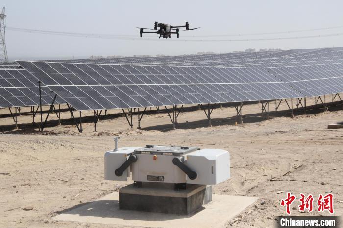 图为5日,大唐第十四师昆玉市100万千瓦光伏基地,无人机正在巡检光伏组件运行情况。马晓东 摄